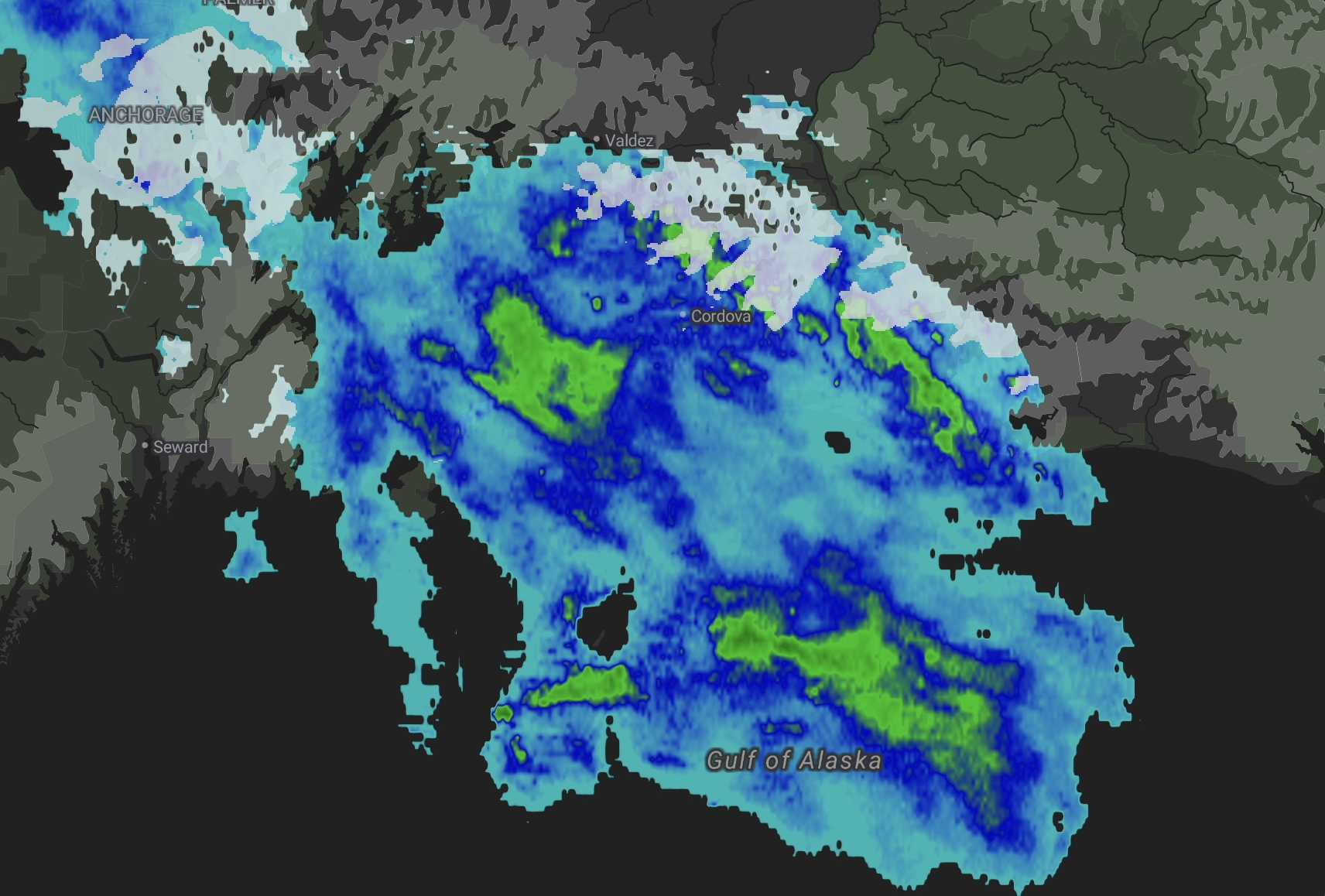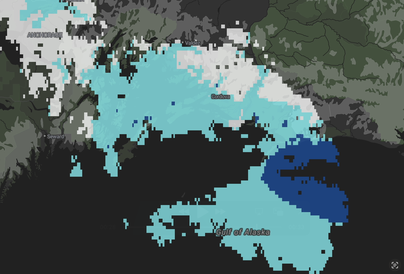 We do something fairly simple to display the likely precipitation type with the radar. Specifically, we’ll grab the temperature at the appropriate time and approximate where we think the snow/rain cutoff is likely to be. You can see that pretty clearly in one of the Alaska timesteps.